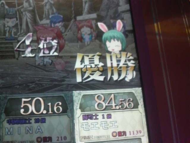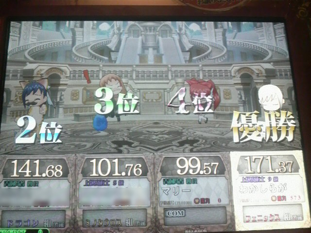 4回ぐらいやったかな?3人共ほぼ互角で接戦になることが多かったです。1点以下の差でユリの人に負けたのは悔しかったぜ…画像は単独2回ほど取れたおかげで優勝できた時のもの。楽しかったー