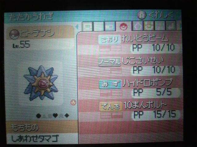 BPが少なくなってきたのでタワーに登ろうとしたら2週目でムウマたんにフルボッコされて泣きたくなったので、タワー用っぽいスターミー育てました。うむ、じつにベタな構成ですね。